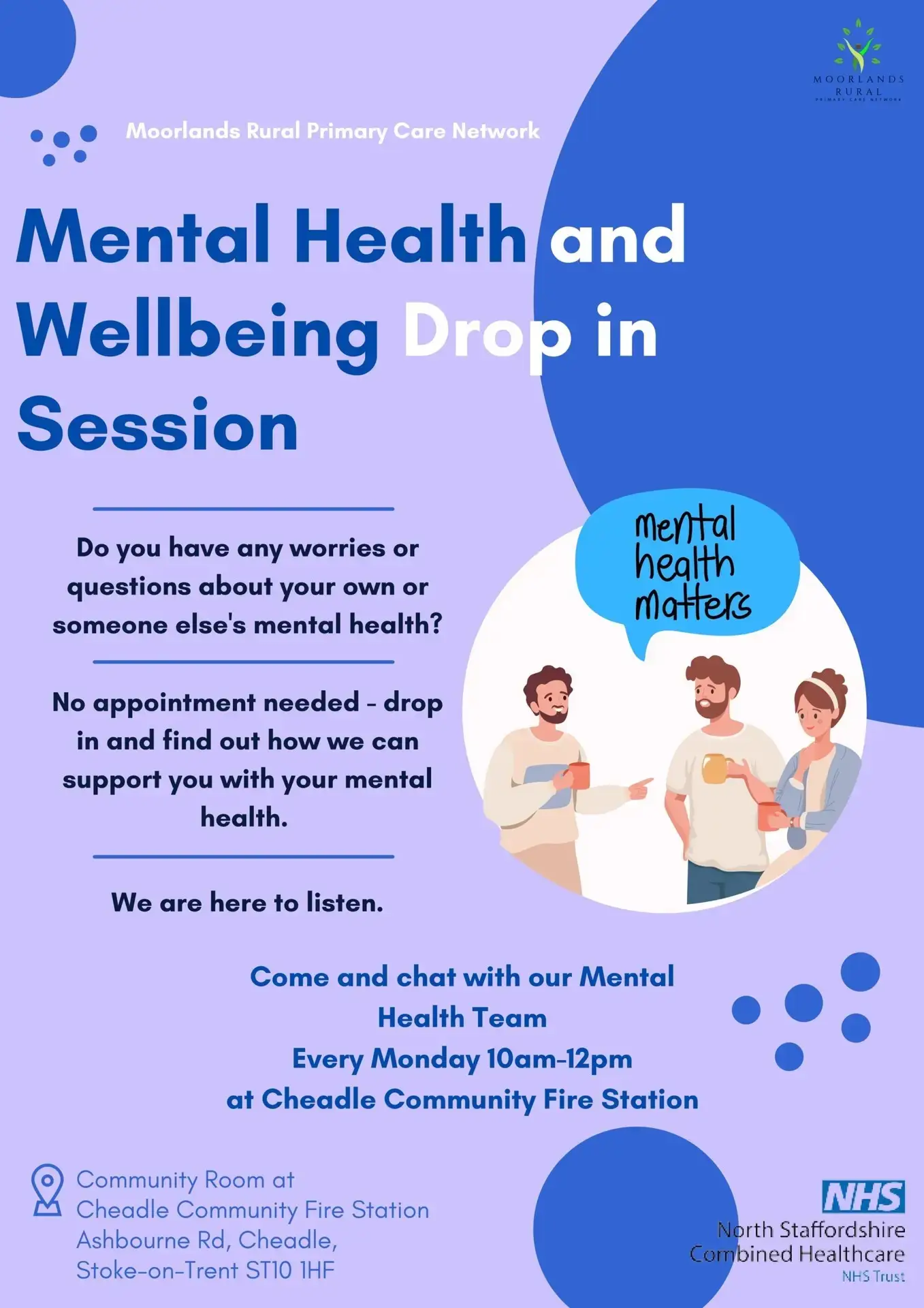 • Mental Health and Wellbeing Drop in Session: Every Monday 10:00am to 12noon at Cheadle Community Fire Station