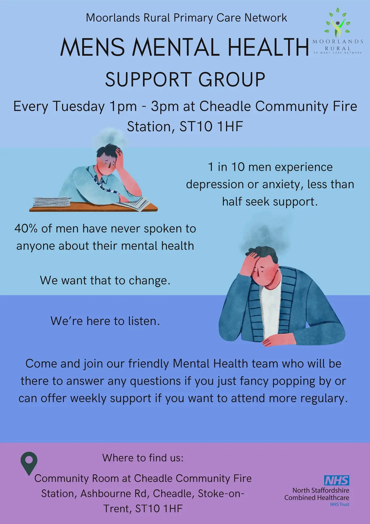 • Mens Mental Health Support Group: Every Tuesday 1:00pm to 3:00pm at Cheadle Community Fire Station, ST10 1HF